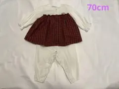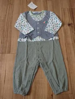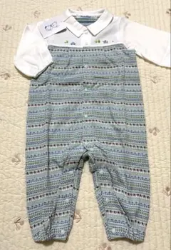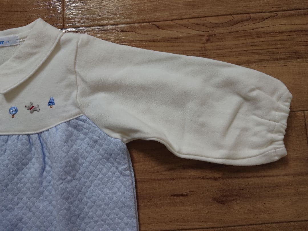 刺繍デザインの水色と白のロンパース、70サイズ、キルティング素材。
