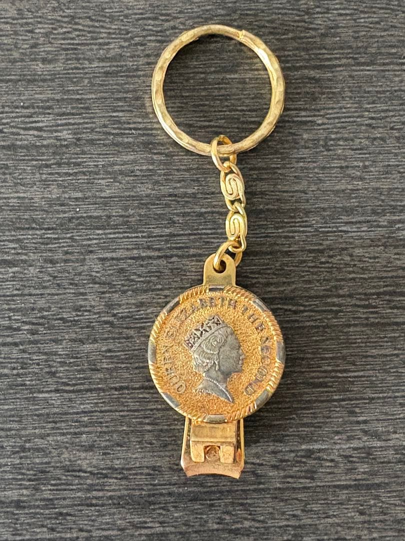 コイン型の金属製キーホルダー、エリザベス二世が特徴的。
