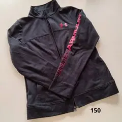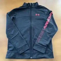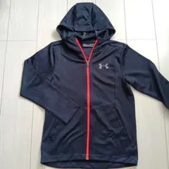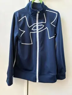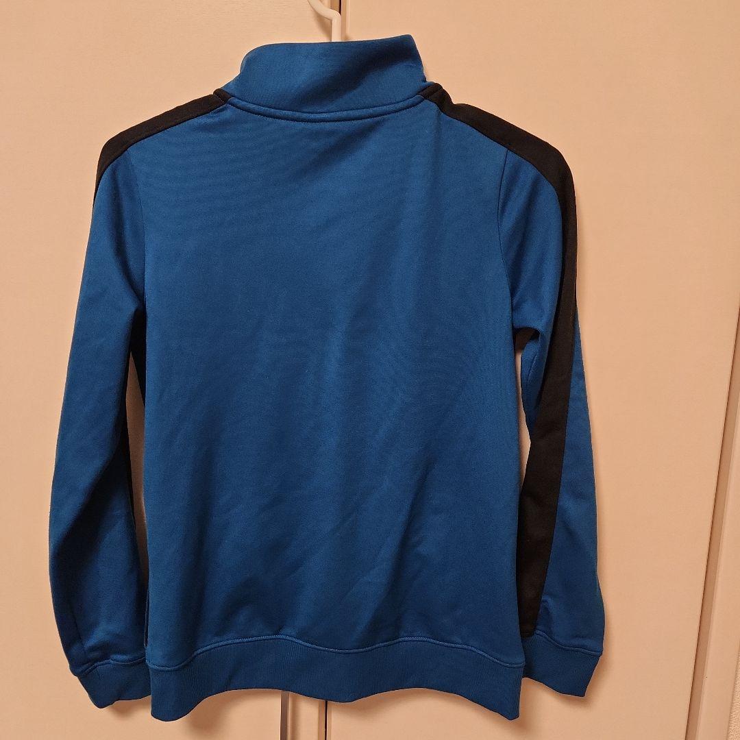 青と黒のジップアップジャケット、ポリエステル混紡素材で快適な着心地。