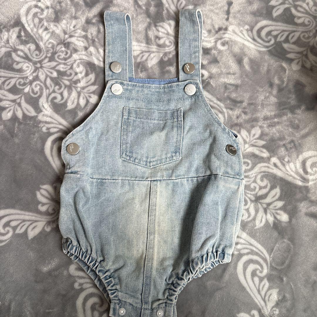 ライトブルーのデニムオーバーオール、ボタン付きでポケットあり。