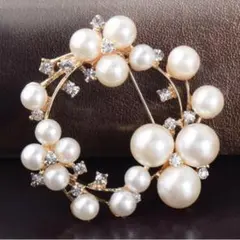 大小異なるパールと、きらりと光るラインストーンが散りばめられた、上品なサークル型(リース型)のブローチです。