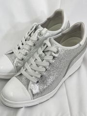 グリッター生地の上にフラワーレースの可愛いパンプスです。色は水色がかかったグレーです。