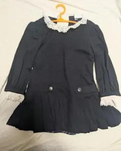 ネイビーとホワイトのストライプ柄、リボンベルト付きの長袖ワンピース。