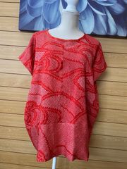 黒と青の模様が特徴的なカジュアルベスト、赤い裏生地で和風スタイル。