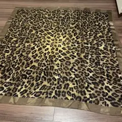 明るめのクリアなネイビーのシルク風スカーフ、装飾的な模様が特徴。