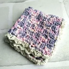 生成り色にレモン ピンク 水色が混じったコットン糸にアイボリー色のフリンジの付いてる糸を使って縁編みをしました。