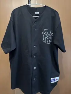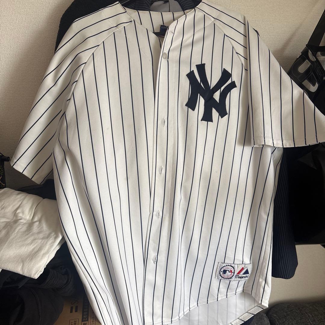 ニューヨーク・ヤンキースのストライプベースボールシャツ、刺繍ロゴ付き。