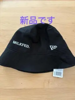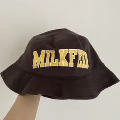 リブ編みのグレー地に花柄のバケットハット、milkfedの刺繍入り。