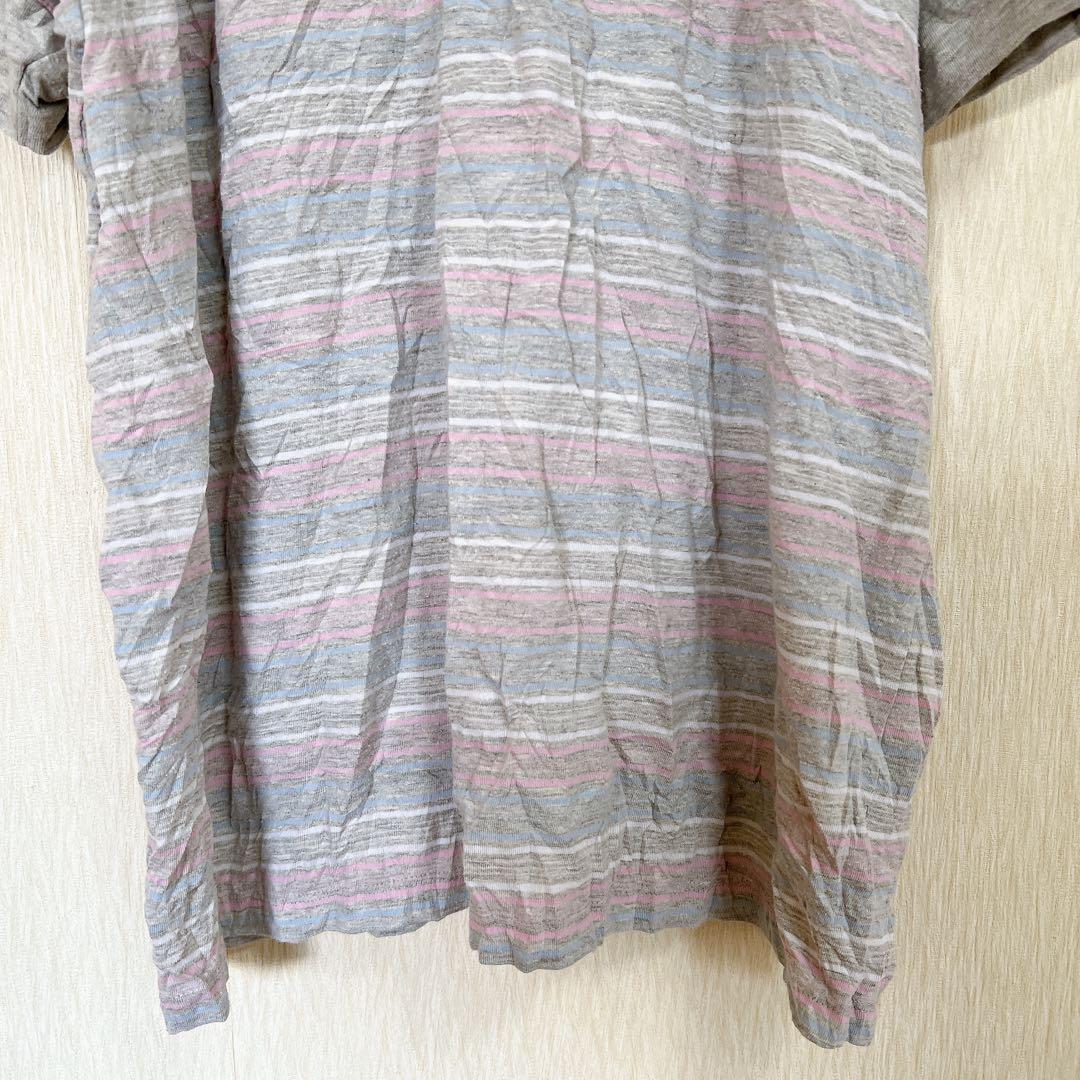ストライプデザインのグレーとピンクのVネックTシャツ、XXLサイズで快適な着心地。
