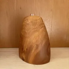 屋久杉の細長いデザインの一輪挿し、ラベル付きで独特の魅力を持つ。