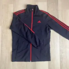 ネイビーカラーのadidasジャージ、ストライプデザインでスタイリッシュ。