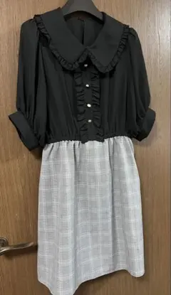 ワンピースと同じ生地の布ベルト(黒)付きでウエストマークできるようになっております。