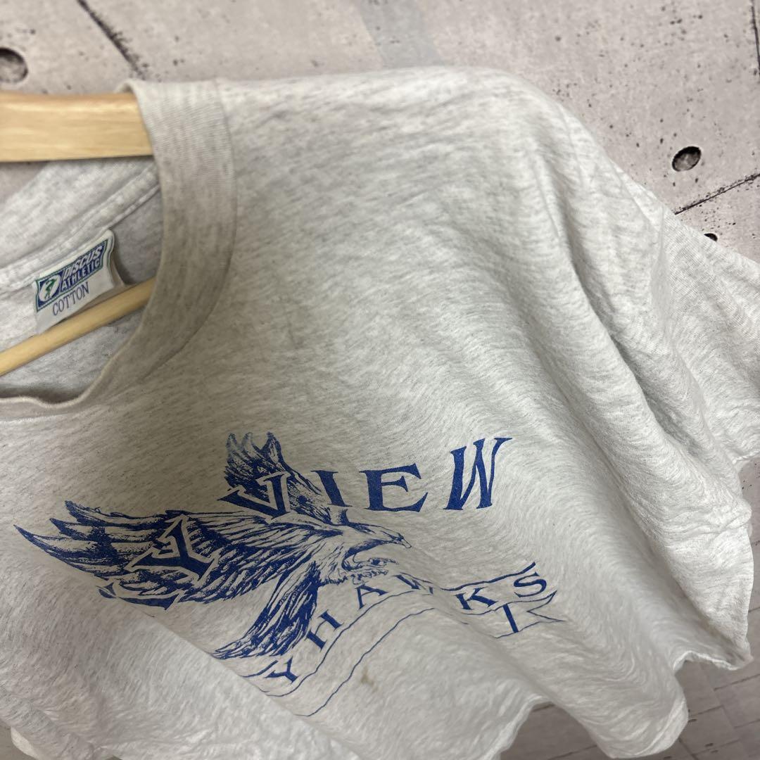 - デザイン: グレーのTシャツ、青いプリント、空を飛ぶ鷲のデザイン