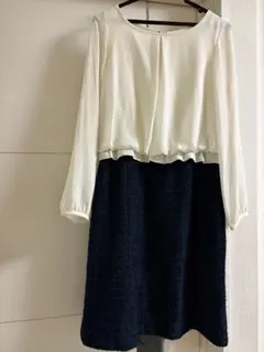 黒地にベージュのドット柄、七分袖のカジュアルワンピース。
