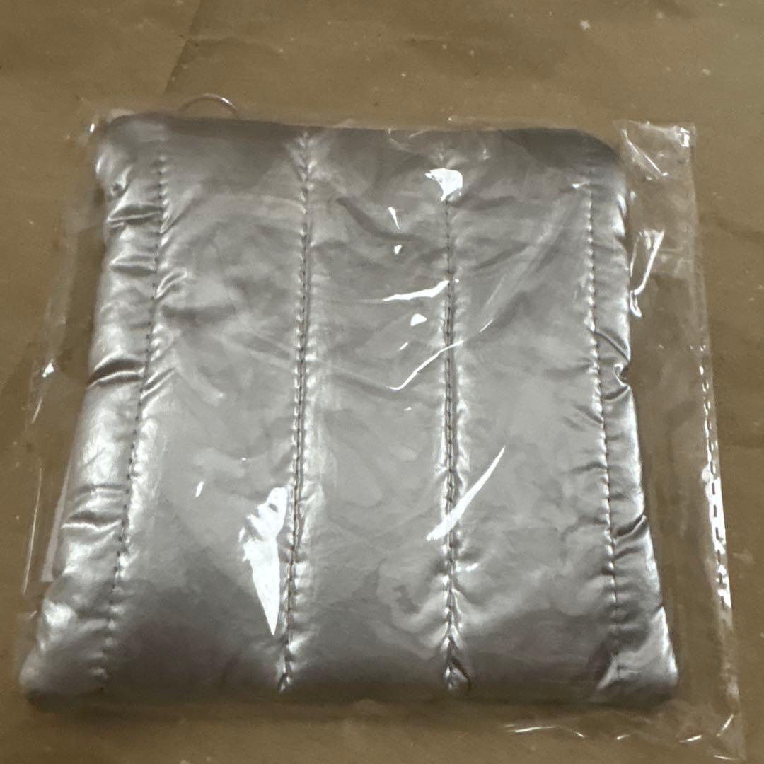 シルバーのキルティングデザインのポーチ、ナイロン素材で軽量。