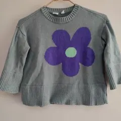 グリーンのセーターに大きな紫色の花柄デザイン。