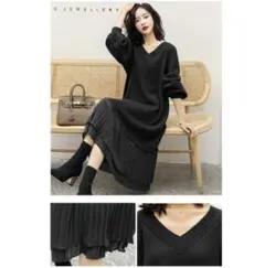 【ellerie】バイカラー切り替えプリーツロングワンピース
