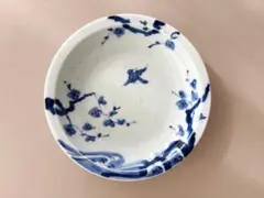 画像の大皿には、山や橋、家屋、船などが描かれた日本の風景が染付で表現されています。