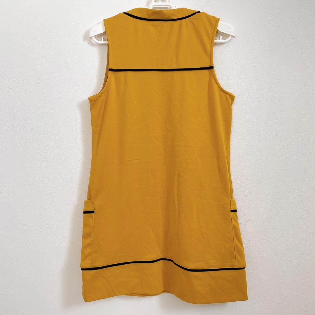 マスタードカラーのノースリーブミニワンピース、ボタンとポケット付きでカジュアルなスタイルに最適。