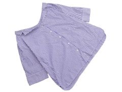 リネン風の青い7分袖シャツ、リボン付きデザイン。
