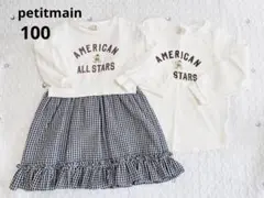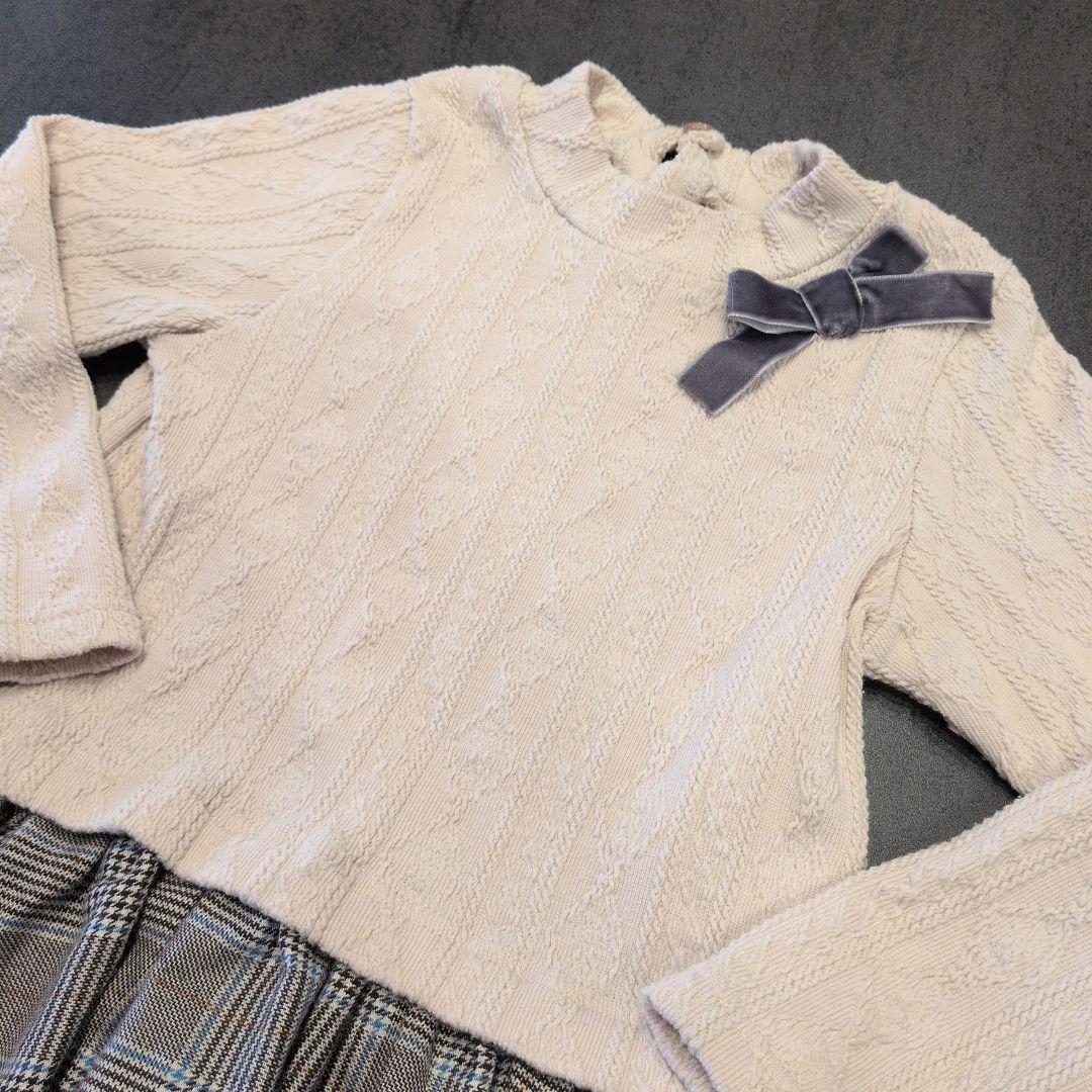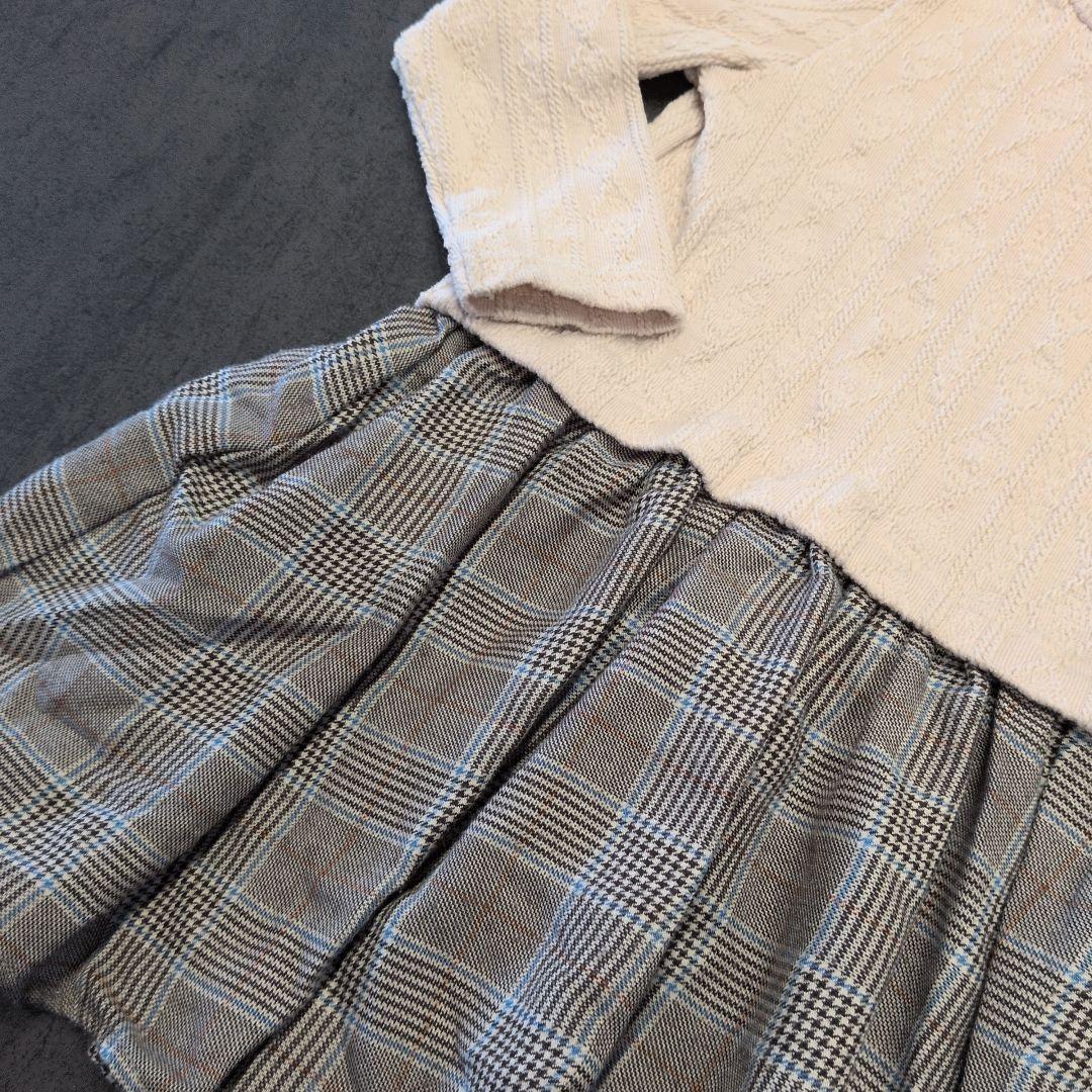 ケーブル編み風トップスととチェック柄スカートの組み合わせ。セットアップ風ワンピース