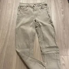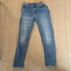 ライトブルーのスキニージーンズ、ダメージ加工あり。伸縮性あり。