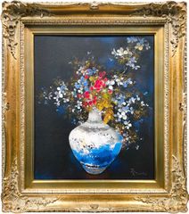 画面いっぱいに広がる鮮やかな色彩と伸びやかな筆致が魅力的な鮮やかで可愛らしく愛らしい風景画です。描かれているのはヴェネツィアの「サンタ・マリア・デッラ・サルーテ聖堂」と思われ、運河越しに咲き誇る花々を前景に配置することで、奥行きと華やぎを巧みに演出しています。明るい空の下に広がる大聖堂の白亜の姿は堂々たる存在感を放ち、近景の赤い花との対比によって一層輝きを増しています。光と色彩の調和を重視した構成は、印象派の流れを汲みながらも独自の装飾的な美しさを兼ね備え、鑑賞者に旅情と高揚感を与えます。豪奢な金の額装も相まって、室内を華麗に彩るギャラリークラスの一点