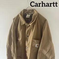 ダークグリーンのCarhartt製XLサイズカバーオール、ボタン付きデザインで実用的なポケット付き。
