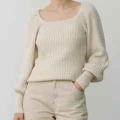 ケーブルニットデザインのホワイトセーター、バルーンスリーブでトレンド感あり。