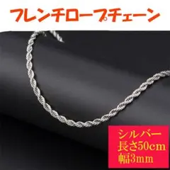 シルバーのロングチェーンネックレス、シンプルでスタイリッシュなデザイン。