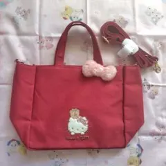 ピンクのチェック柄、リボン装飾の大容量トートバッグ。