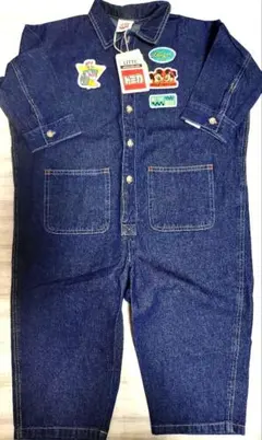 デニム素材の120cmオーバーオール、ディズニーモータースのプリントとパッチ付きで、カジュアルなスタイルに最適です。