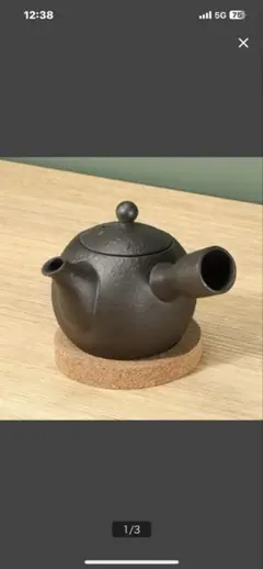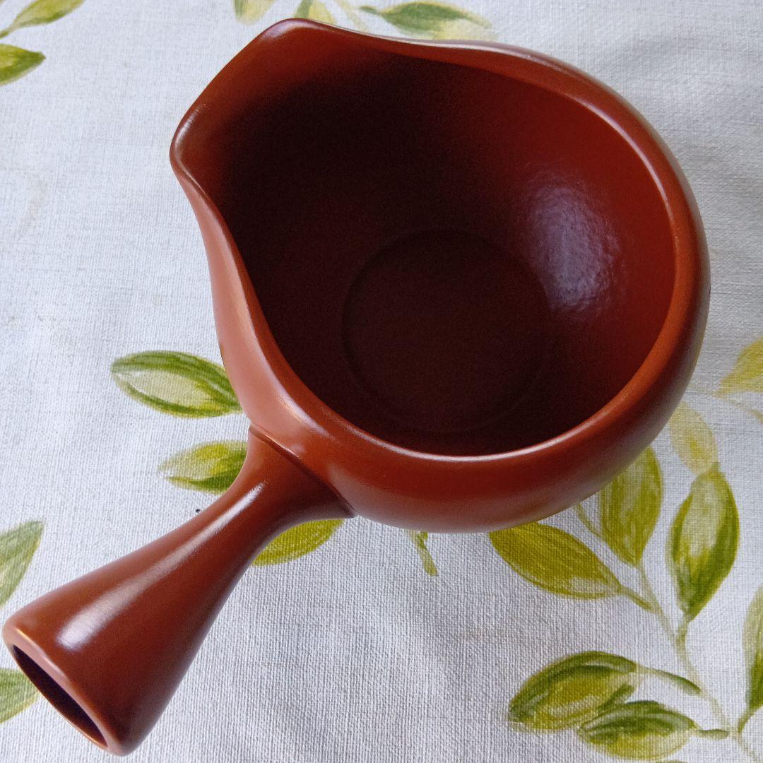 茶色い陶器製茶器、花模様付き。