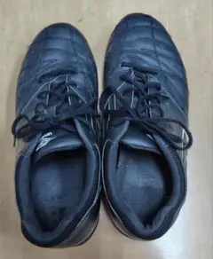 合成皮革製の青いサッカーシューズ、クッション性のあるソールが特徴。
