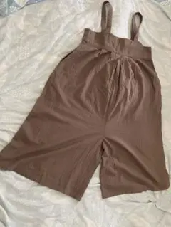 リネン素材のベージュノースリーブサロペット、サイドボタン付きで涼しげなデザイン。