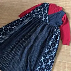 変わった絣と朱色のボタン、紅花染め?がポイントポケット付きのワンピース。
