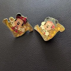 ミッキーマウス、ミニーマウスのアイスキャンディーデザインのピンバッジ、オレンジとピンクの色合いが特徴。