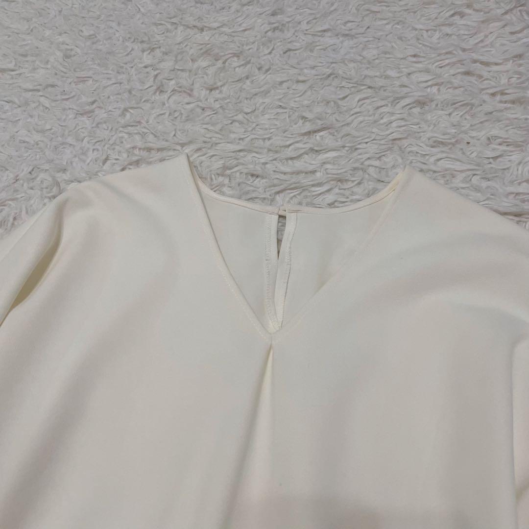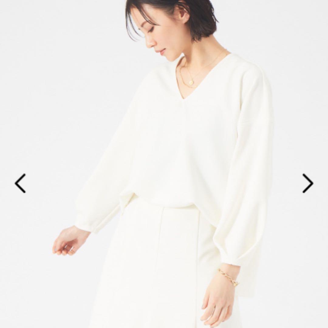 Vネックでシャープな分、袖はパフスリーブで柔らかな印象に。