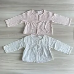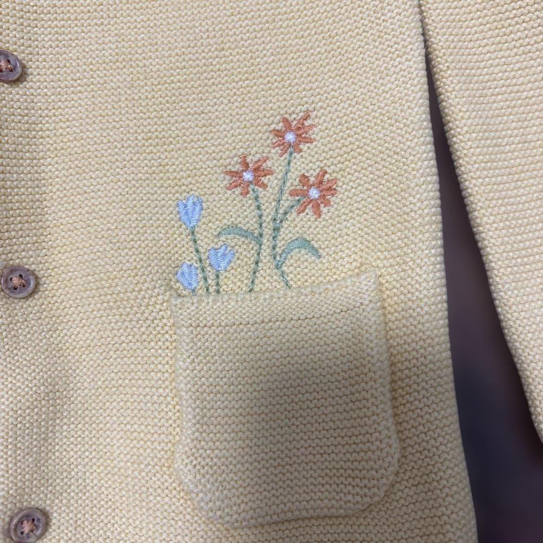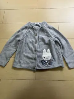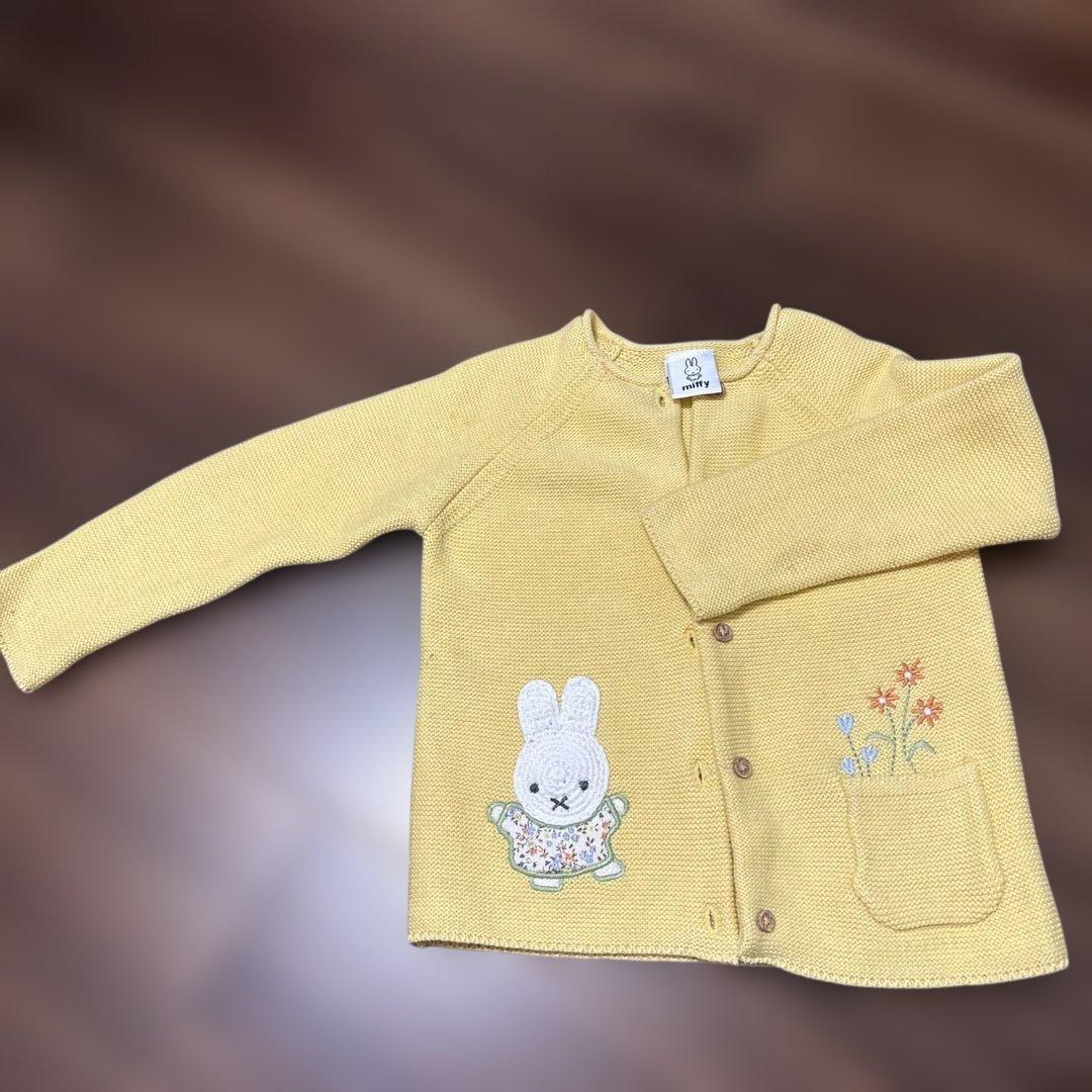ミッフィーの刺繍が施されたイエローのニットカーディガン。