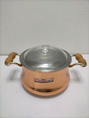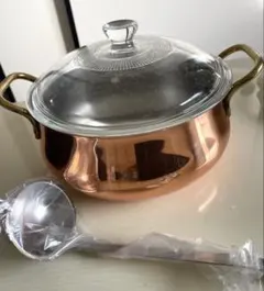 銅製の両手鍋、ガラス蓋付き、木製お玉付き。