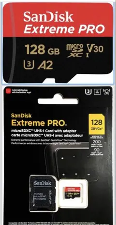 128GBのSanDisk Extreme PRO microSDXCカードは、U3、A2、V30の速度クラスを備え、高速データ転送が可能です。