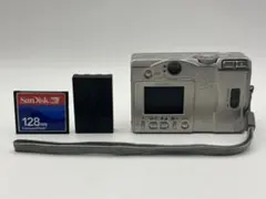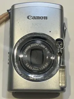 スリムなボディのCanon IXY DIGITAL、FUNCボタン付き、バッテリー付属。