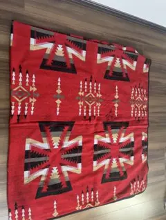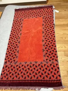 幾何学模様のカーペット、赤と青の色合いが特徴。