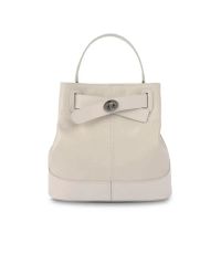 オフホワイトのボックススクエアショルダーバッグです。正面のシルバーロゴが目を引きます。