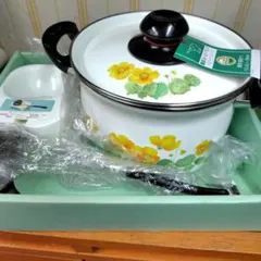 リボンと花柄が可愛い、レトロなホーロー両手鍋です。