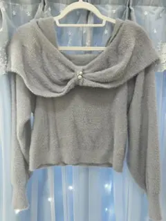 オフショルダーのグレーセーター、アクリル素材で快適な着心地。