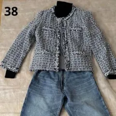 自由区のツイードジャケットです。シルバーのラメ糸が織り込まれており上品にキラキラと輝く高級感のあるデザインです♡ブラック×ホワイトベースで、フォーマルな場面にぴったりの一着です。前面はホック式(5ヶ所)。両サイドにポケット付き。裏地は黒で、しっかりとしたつくりです。