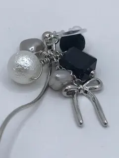 ハート型のリボン付きイヤリング、シルバーとカラーストーンのデザイン。
