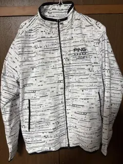フルジップのホワイトジャケット、アメリカ国旗のワッペン付きで、ゴルフシーンに最適。