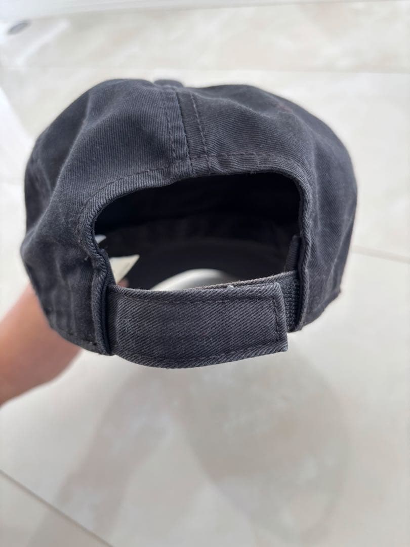 シンプルでスタイリッシュな黒のadidasキャップ、ストライプデザインが特徴。